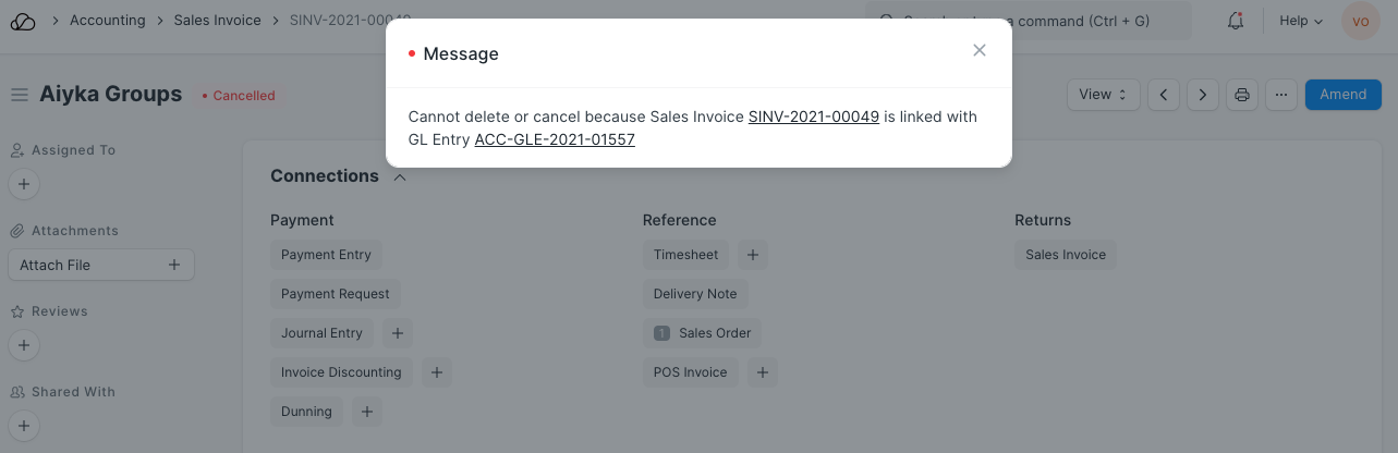 أثناء حذف إدخالات المعاملات مثل إيصال الشراء وفاتورة الشراء وفاتورة المبيعات وإشعار التسليم وإدخالات دفتر الأستاذ، تظهر الرسالة التالية:
