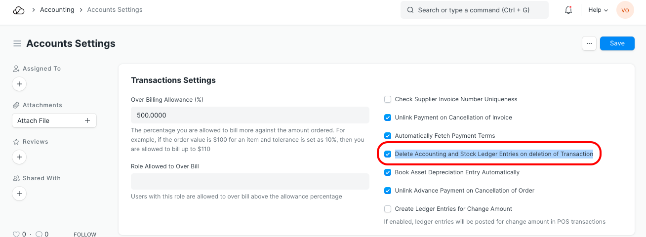 2. قم بتمكين خانة الاختيار حذف إدخالات المحاسبة ودفتر الأستاذ عند حذف المعاملة