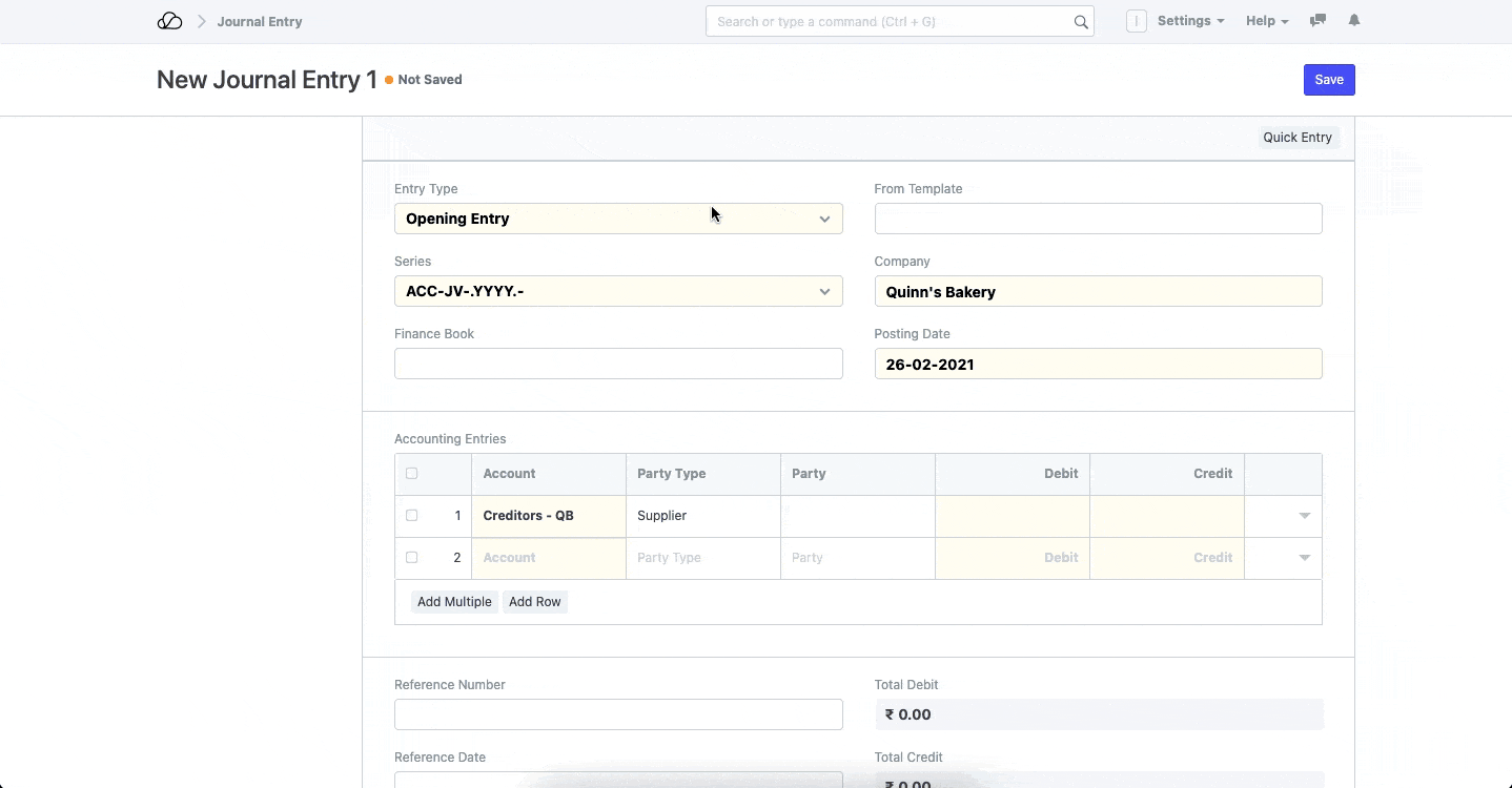 أنشئ قيد دفتر يومية بالنوع قيد افتتاحي، ثم قم بالخصم من حساب الدائن واختيار المورد المطلوب ثم إضافة الحساب الافتتاحي المؤقت.