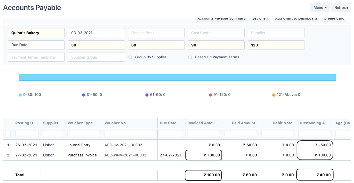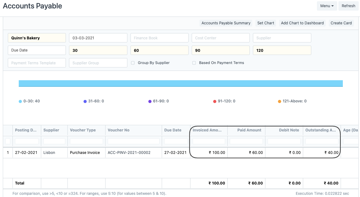 راجع تقرير الحسابات الدائنة بعد إنشاء فاتورة الشراء: