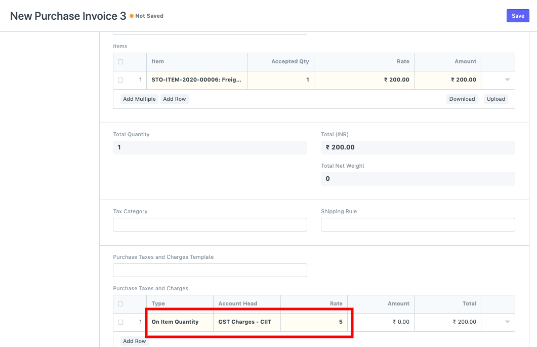 • يمكنك الآن إنشاء فاتورة شراء للمورد وإضافة هذا العنصر لحساب الضرائب المتعلقة بالشحن. يمكنك ضبط ضريبة الشحن على أساس صافي الإجمالي أو كمية السلعة وفقًا لسياسة الشركة.