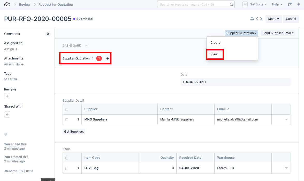 بمجرد إرسال طلب عرض الأسعار، يتم إنشاء عرض أسعار المورد تلقائيًا في النظام مقابل طلب عرض الأسعار هذا. انقر على خيار "عرض".
