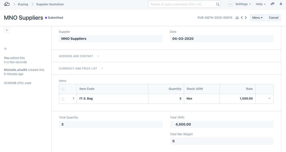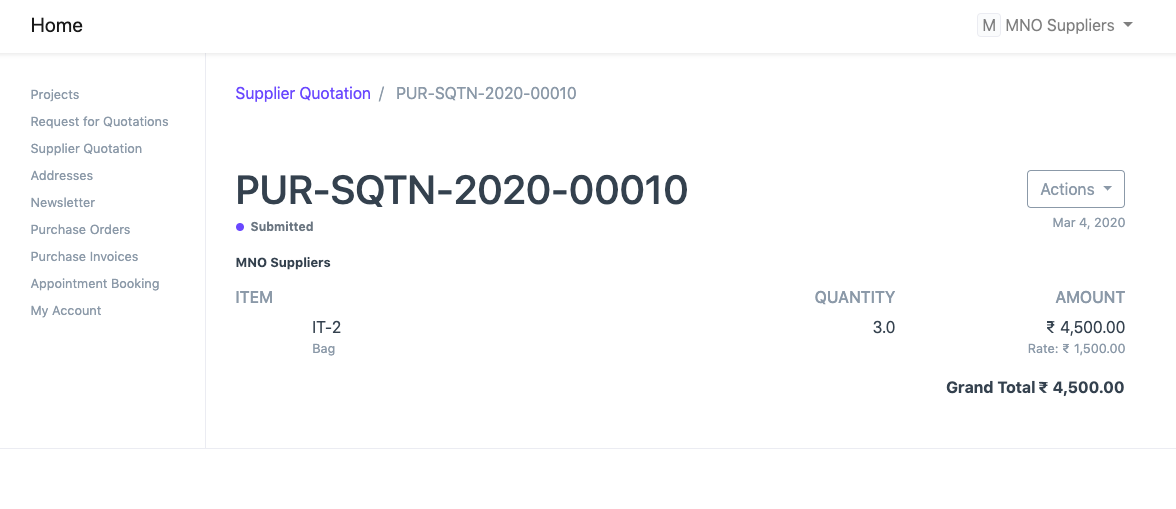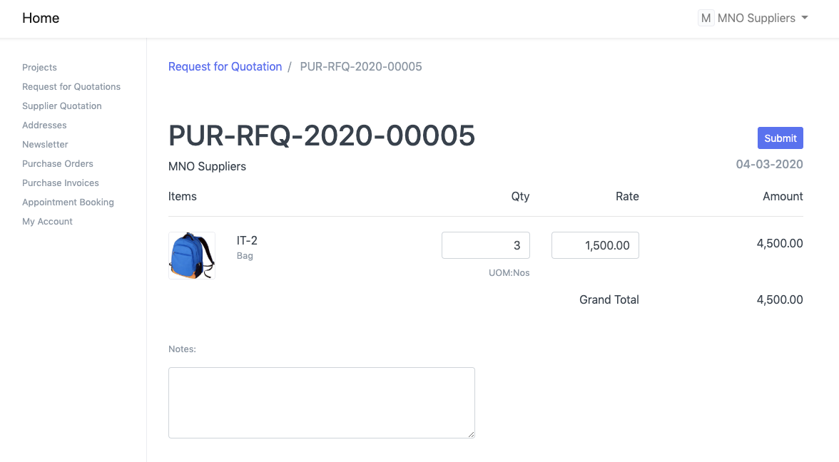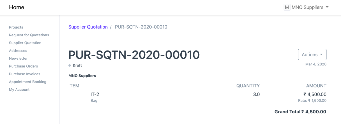 لاحظ أن عرض أسعار المورد في حالة المسودة. بعد مراجعة عرض أسعار المورد، يمكن للمستخدم تقديمه. وسينعكس هذا أيضًا في بوابة الموردين.