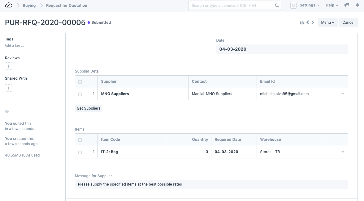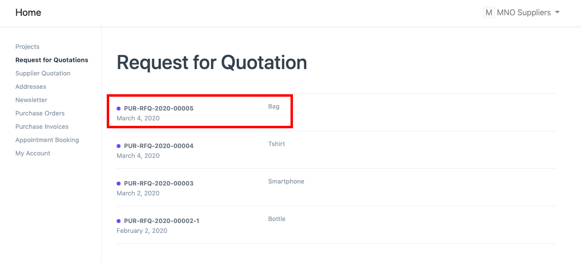 1. إنشاء طلب عرض أسعار للمورد في النظام. على سبيل المثال، نقوم بإنشاء طلب عرض أسعار لـ "موردي MNO".
