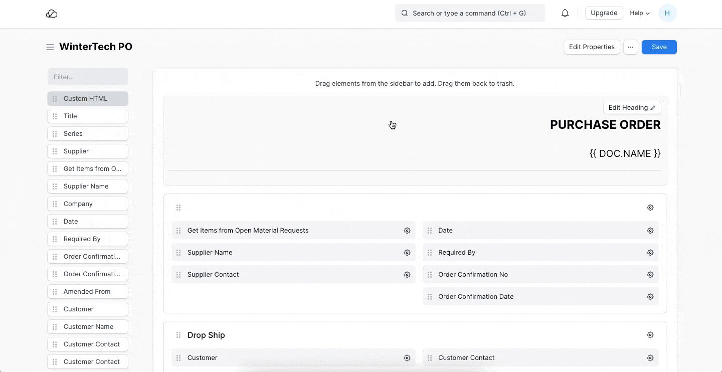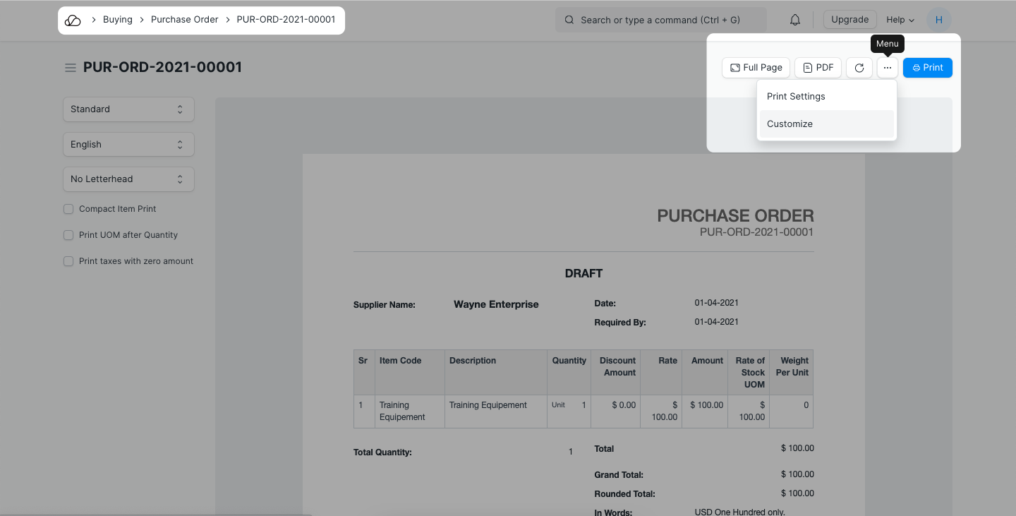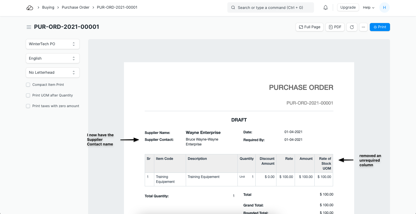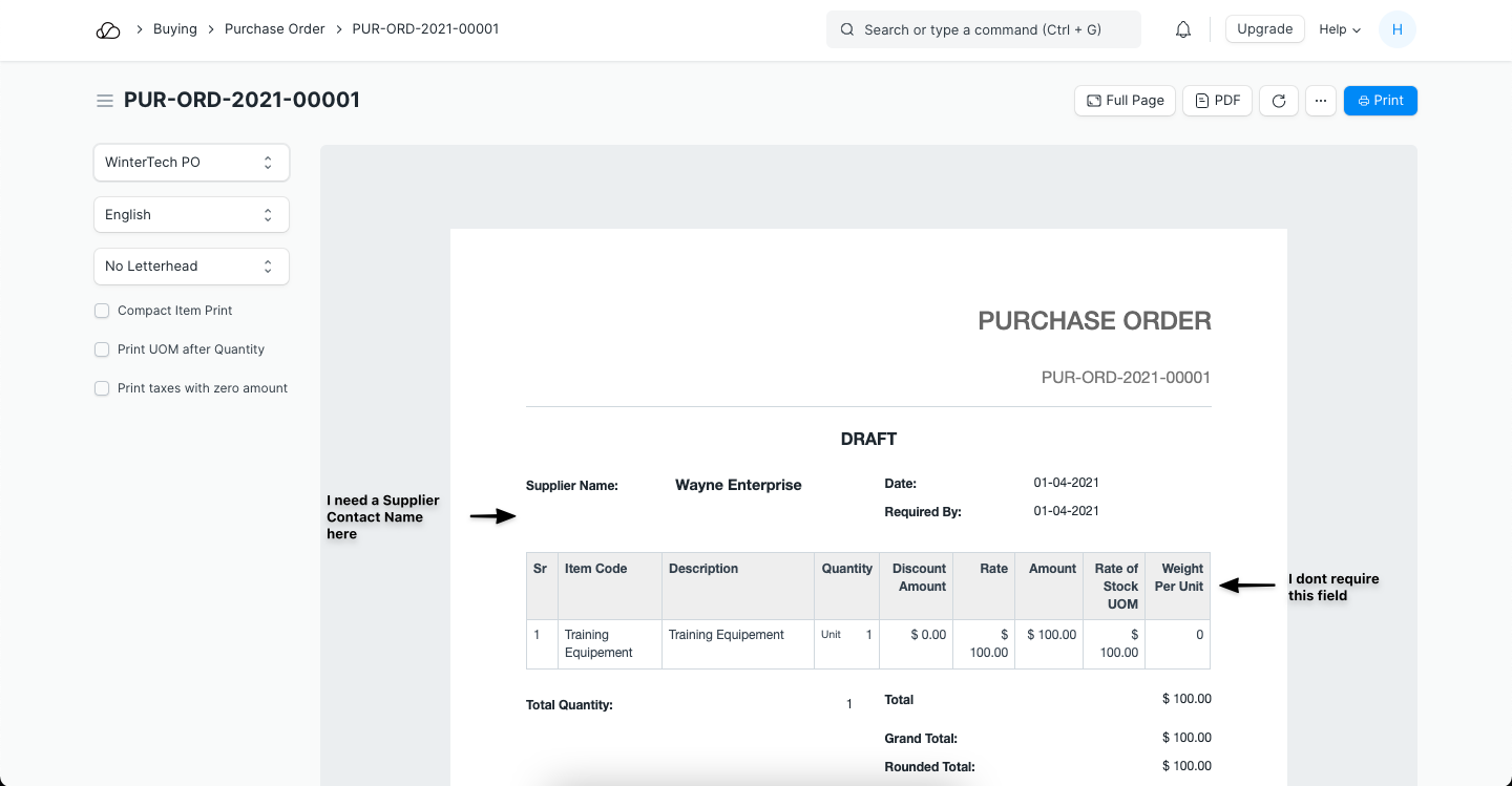للتوضيح، لنأخذ في الاعتبار أمر الشراء الذي يحتوي على الحقول التالية في تنسيق الطباعة، وهنا، أريد إضافة اسم جهة اتصال المورد ضمن اسم المورد وإزالة عمود الوزن لكل وحدة من جدول العنصر.