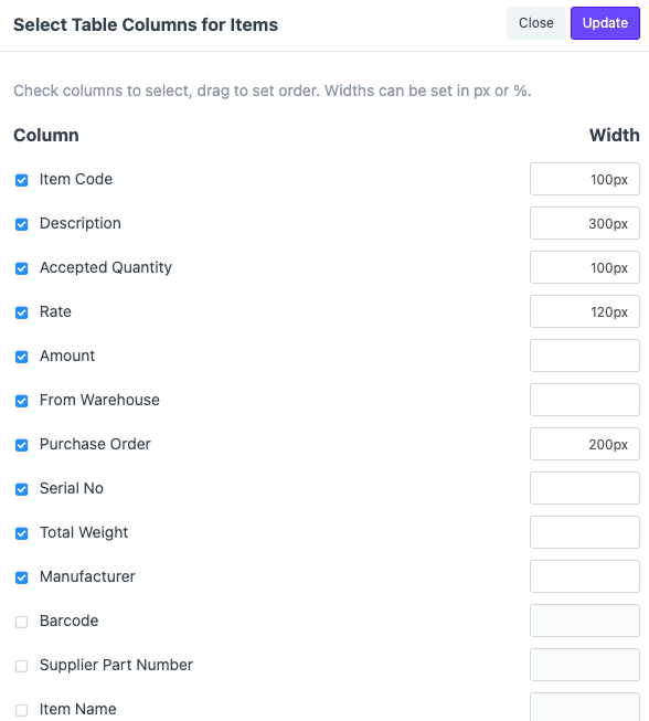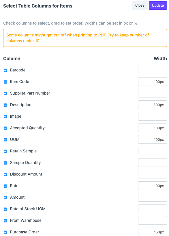 حدد الأعمدة التي تريد الاحتفاظ بها في الجدول الذي تقوم بإنشائه لتنسيق الطباعة المخصص الخاص بك. يمكنك ضبط العرض وترتيبها وفقًا لمتطلباتك.