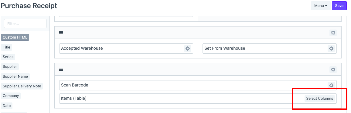 3. بمجرد دخولك إلى تنسيق الطباعة الجديد، يمكنك النقر فوق الزر "تحديد الأعمدة" في الحقل الذي يحتوي على "العناصر (الجدول)"
