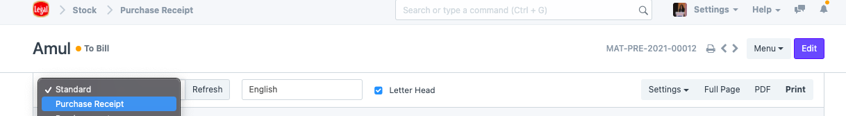 قم بتحديث شاشتك وحدد تنسيق الطباعة الذي تم إنشاؤه حديثًا. وفي هذه الحالة، فهو "إيصال الشراء".