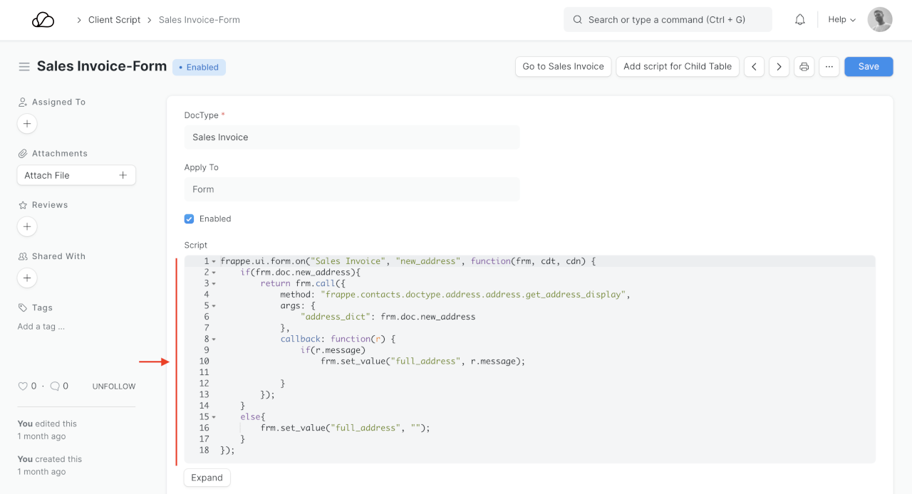 بمجرد تعديل البرنامج النصي للعميل وفقًا لحالة الاستخدام الخاصة بك، يمكننا حفظه وتمكينه من خلال النقر على مربع الاختيار "ممكّن".