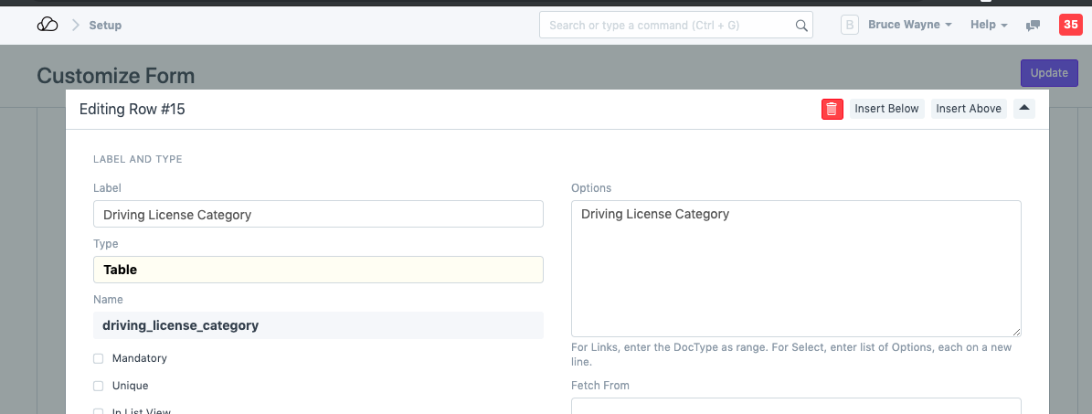 4. يمكنك إضافة حقل جديد أعلاه بالأسفل بالنقر فوق إدراج أعلى/أسفل.