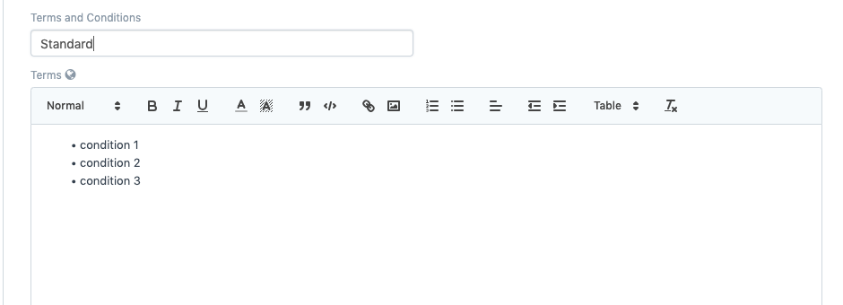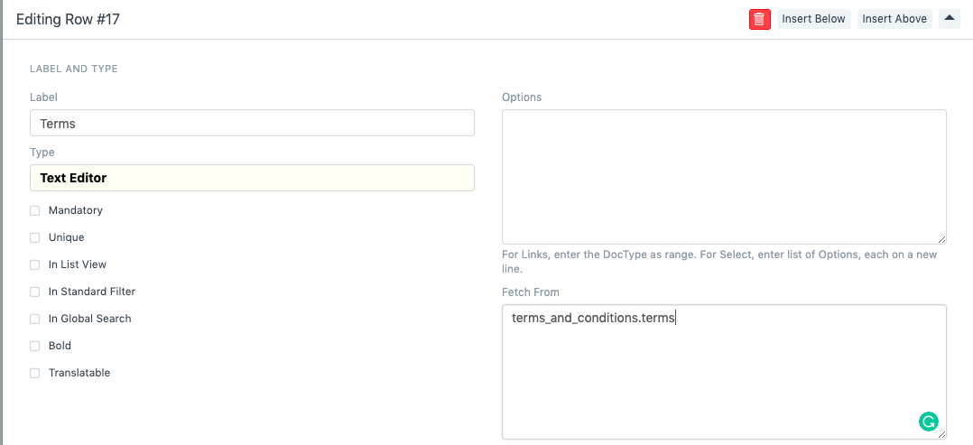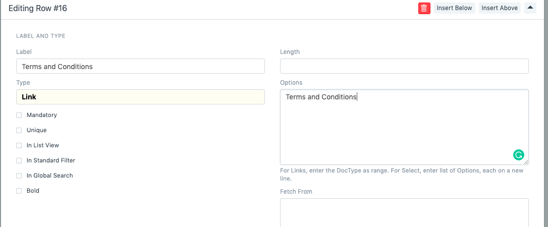 5. قم بإضافة حقل جديد كما هو موضح أدناه: لمزيد من التفاصيل حول إضافة حقل رابط مخصص، راجع هذا الرابط. 6. أضف حقلاً ثانيًا أسفل هذا: كيف يعمل هذا؟ في جلب من، نضيف التفاصيل التالية: doctype.field. في مستند الشروط والأحكام، يُسمى الحقل الذي نضيف فيه المصطلحات terms وهو من النوع: محرر النصوص. لكي يعمل _fetch from_to، يجب أن تكون البيانات بالتنسيق التالي: link_field_name.field_to_fetch 7. بمجرد الانتهاء من ذلك، انقر فوق تحديث، ثم ارجع إلى قائمتك. انقر على Ctrl + Shift + R لإعادة التحميل. 8. عند تحديد قالب الشروط في برنامج التشغيل، سيقوم النظام بجلب الشروط من القالب المحدد: