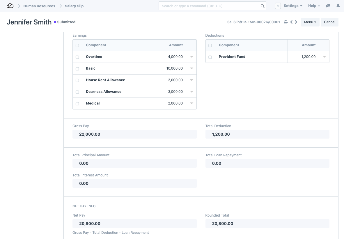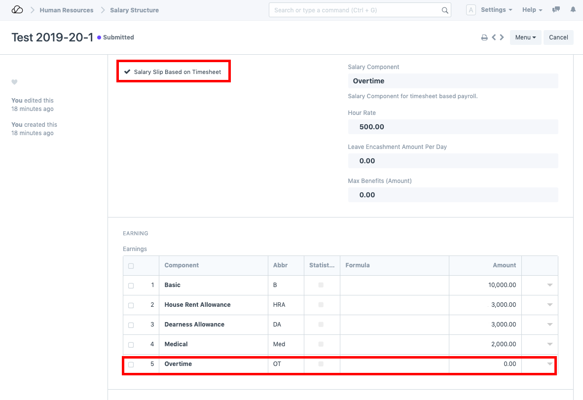 سيقوم قسيمة الراتب الخاصة بالموظف بجلب جميع الجداول الزمنية (إن وجدت) لهذا الموظف التي تم إنشاؤها لهذا الشهر المحدد وحساب مكون العمل الإضافي في قسيمة الراتب وفقًا لذلك.