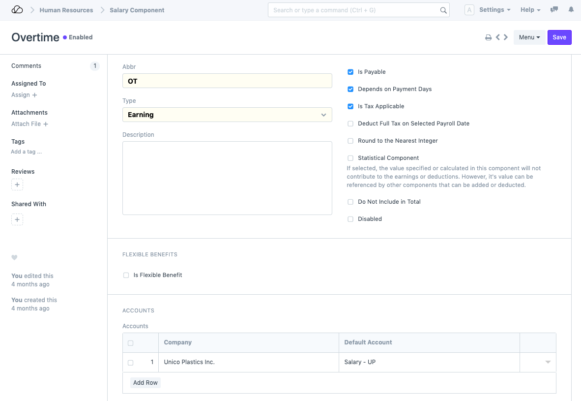 2. قم بإنشاء مكون الراتب يسمى "العمل الإضافي" من نوع الكسب.