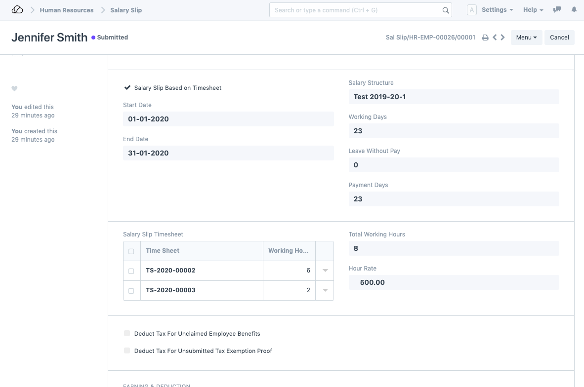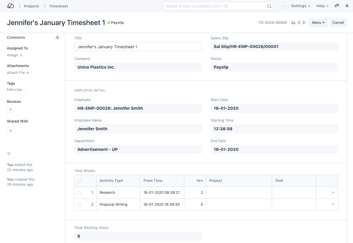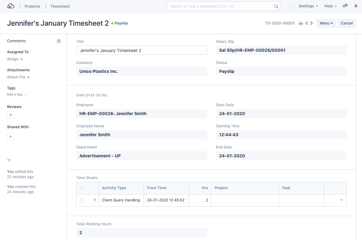 1. قم بإنشاء جداول زمنية لهذا الموظف من خلال Timesheet DocType.