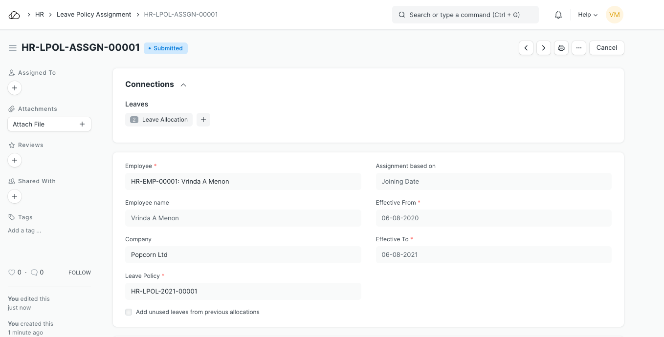 1. قم بإضافتها في سياسة الإجازة وقم بتعيينها للموظف الذي ترغب في إنشاء سياسة الإجازة له من خلال الانتقال إلى تعيين سياسة الإجازة. سيتم تخصيص الإجازات تلقائيًا بمجرد "إرسال" تعيين سياسة الإجازة.