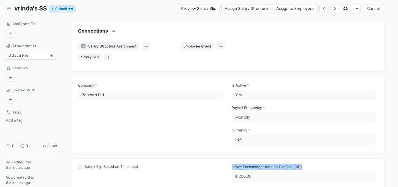 1. قبل إنشاء إجازة مستحقة للصرف بنوع الإجازة القابلة للصرف الذي تم إنشاؤه مسبقًا، تأكد من تعيين هيكل الراتب للموظف وأنك قمت بإضافة "مبلغ الإجازة النقدي لكل يوم (INR)" لـ نفس هيكل الراتب