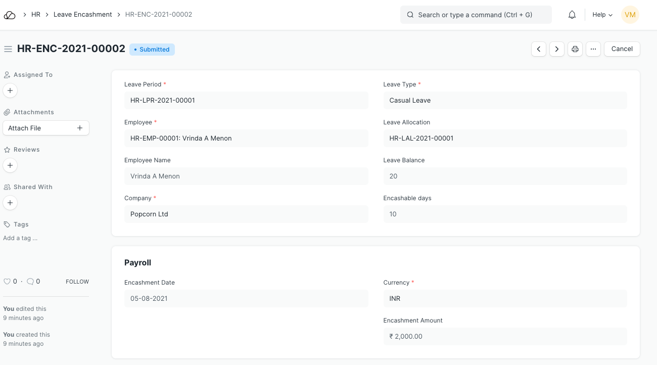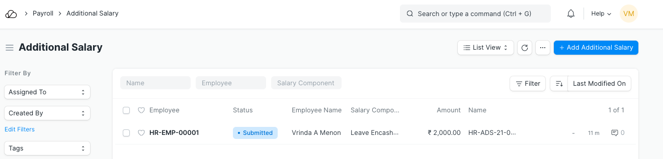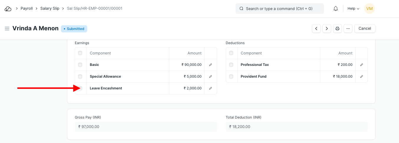 1. عند إنشاء قسيمة الراتب، سيتم إضافة مبلغ الإجازة النقدية مع الأرباح الأخرى إلى قسيمة الراتب كما هو موضح أدناه.