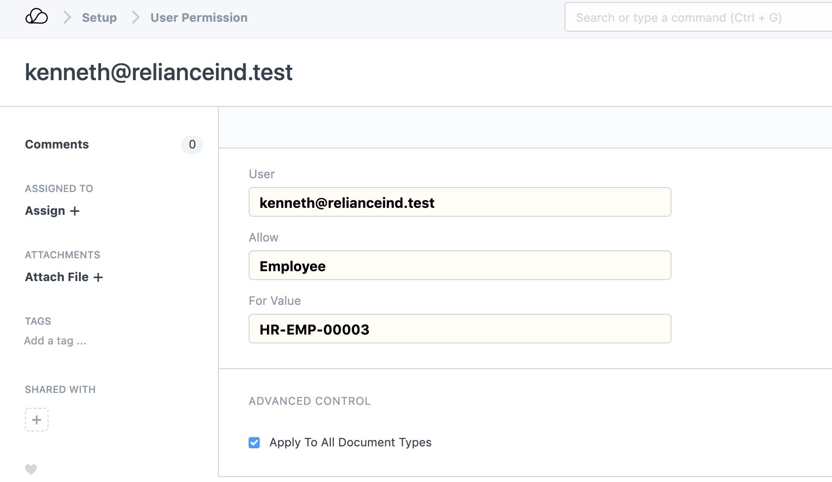 وأيضًا، عندما يتم ربط المستخدم بالموظف، فإنه يقوم بإنشاء إذن مستخدم على النحو التالي. وفقًا لإذن المستخدم هذا، سيُسمح للموظف بمراجعة المستند الخاص به الذي تم إنشاؤه في وحدة الموارد البشرية + المستند الذي تم إنشاؤه للموظفين الذين يقدمون تقاريرهم إلى صاحب السمو.