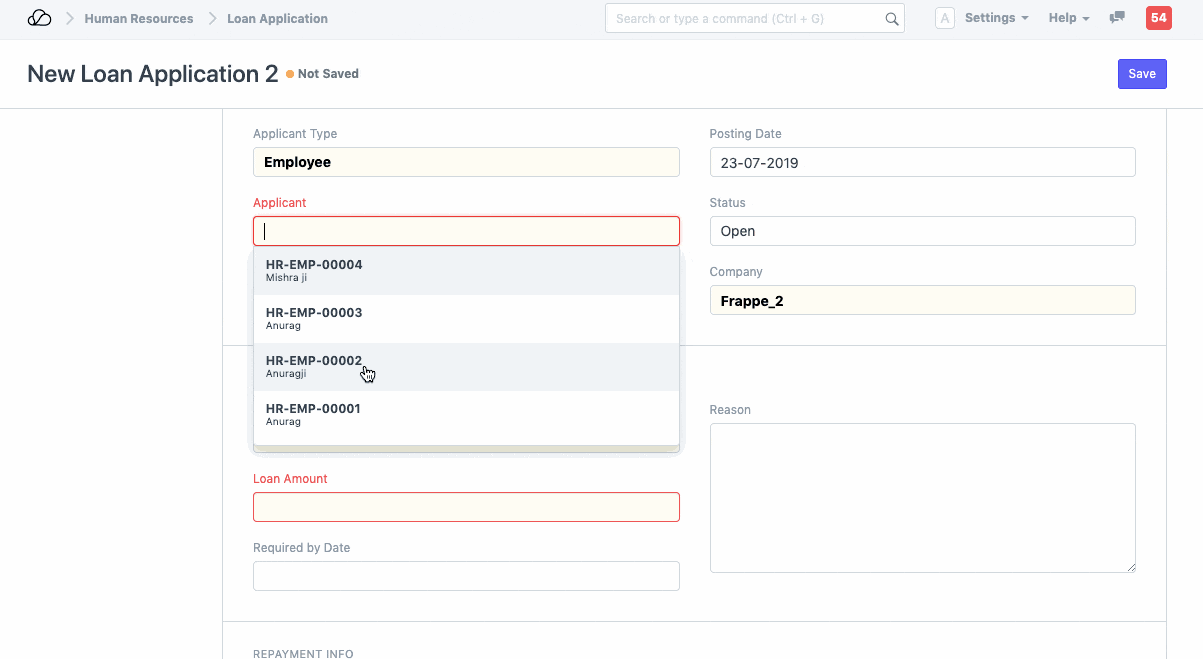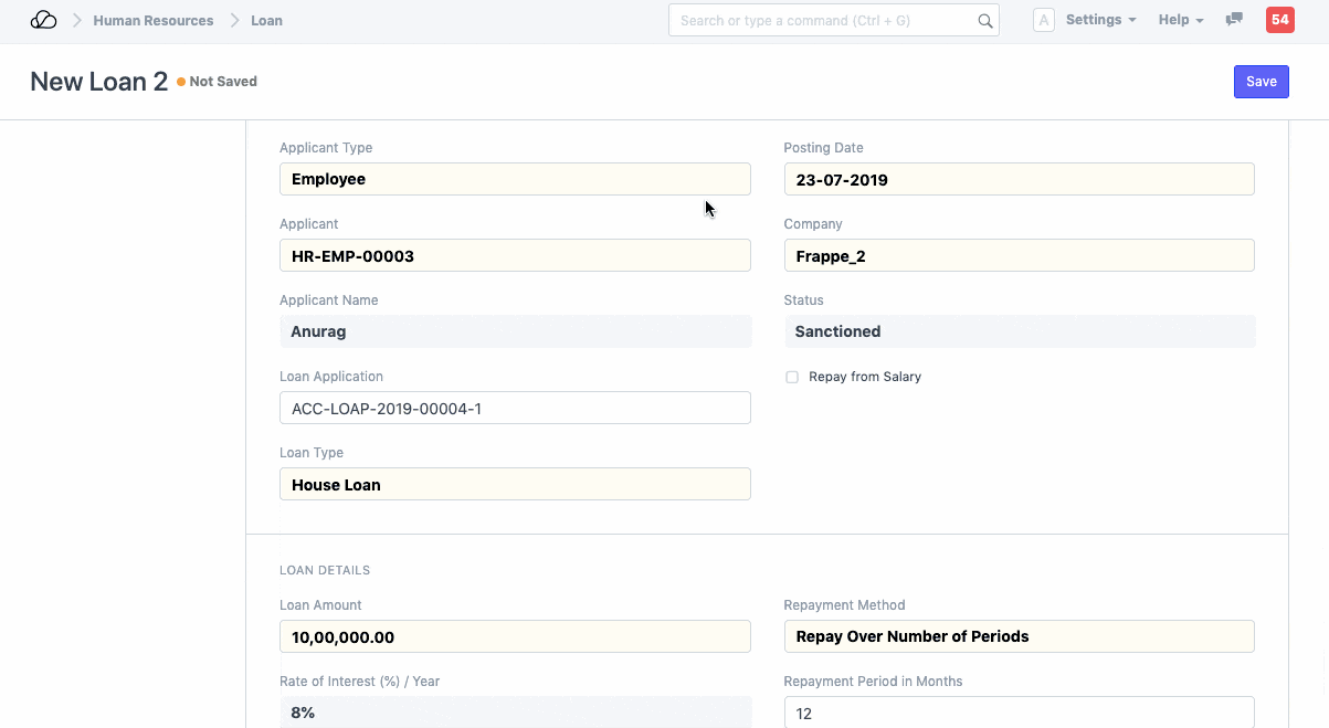1. الآن، يحتاج الموافق على القرض إلى إنشاء قرض لطلب القرض المعني. يجب عليه/عليها ملء تاريخ بدء السداد، وطريقة الدفع، وحساب الدفع، وحساب القرض، وحساب دخل الفائدة، وبعض الحقول الإلزامية. في البداية، يتم فرض عقوبات على حالة القرض. توجد خانة اختيار "السداد من الراتب" والتي توفر للموظف خيار سداد مبلغ القرض من راتبه.