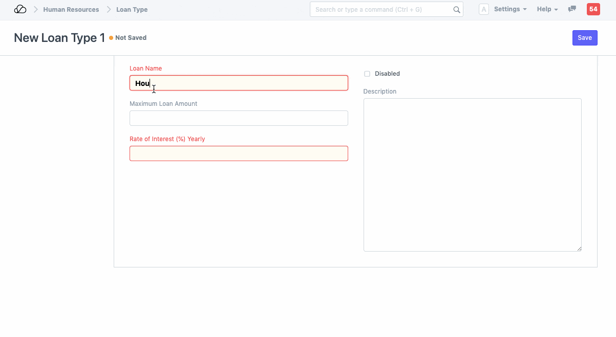 1. لهذا، تحتاج أولاً إلى إنشاء نوع القرض حيث تحتاج إلى ملء الحقول الإلزامية، مثل اسم القرض، وسعر الفائدة (٪) سنويًا. هنا يمكنك أيضًا تحديد الحد الأقصى لمبلغ القرض ووصفه إن وجد.