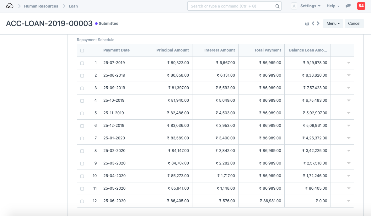بعد تقديم المستند، يتم إنشاء جدول سداد القرض كما هو موضح أدناه: