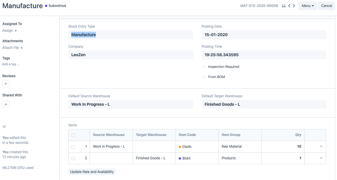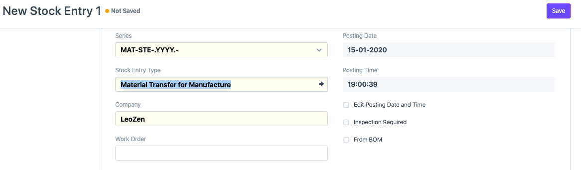 1. قم بإنشاء إدخال مخزون لغرض التصنيع، وسيكون للعنصر الذي يتم تصنيعه مستودع مستهدف، بينما سيكون للعناصر الأخرى (المواد الخام) مستودع مصدر.