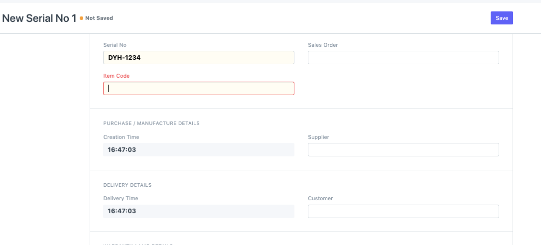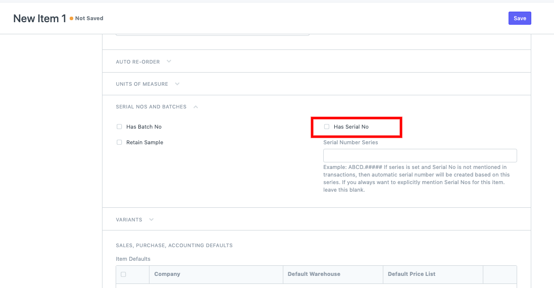 انتقل إلى قائمة العناصر --> إنشاء عنصر جديد --> تحقق من يحتوي على رقم تسلسلي