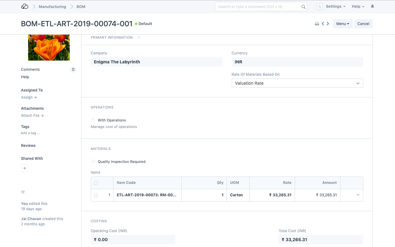 1. قم بإنشاء BOM (قائمة المواد) للعنصر المتعاقد عليه من الباطن وقم بتضمين المواد الخام التي ترسلها إلى المقاول من الباطن للحصول على المنتج النهائي/شبه النهائي. لن تكون هناك عمليات في قائمة مكونات الصنف هذه نظرًا لأن الأنشطة لا تتم عند نهاية الشركة المصنعة. في مثالنا، BOM لـ RM-111-Colored-Flower هو كما يلي: