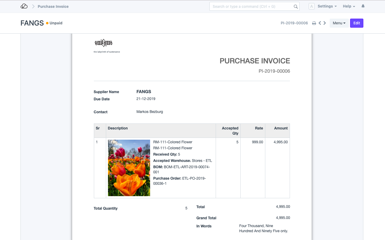 1. فاتورة الشراء التي تم إنشاؤها لهذه المعاملة: (معاينة تنسيق الطباعة)