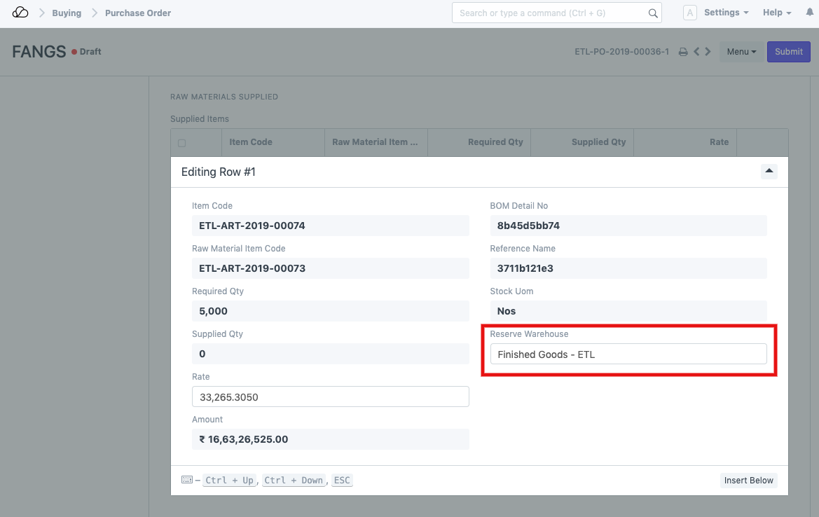 1. يوجد أيضًا جدول فرعي آخر يوضح حالة المواد الخام المطلوب نقلها مقابل أمر الشراء هذا. في هذا الجدول، عليك تحديد "المستودع الاحتياطي" الذي سيتم نقل المواد الخام منه إلى مستودع البائع الافتراضي الذي اخترناه في الخطوة السابقة. يخبرك هذا الجدول أيضًا بعدد العناصر التي تم توريدها بالفعل، في حالتنا، هو صفر لأننا لم نقم بعد بتقديم الطلب وتوريد المواد الخام.