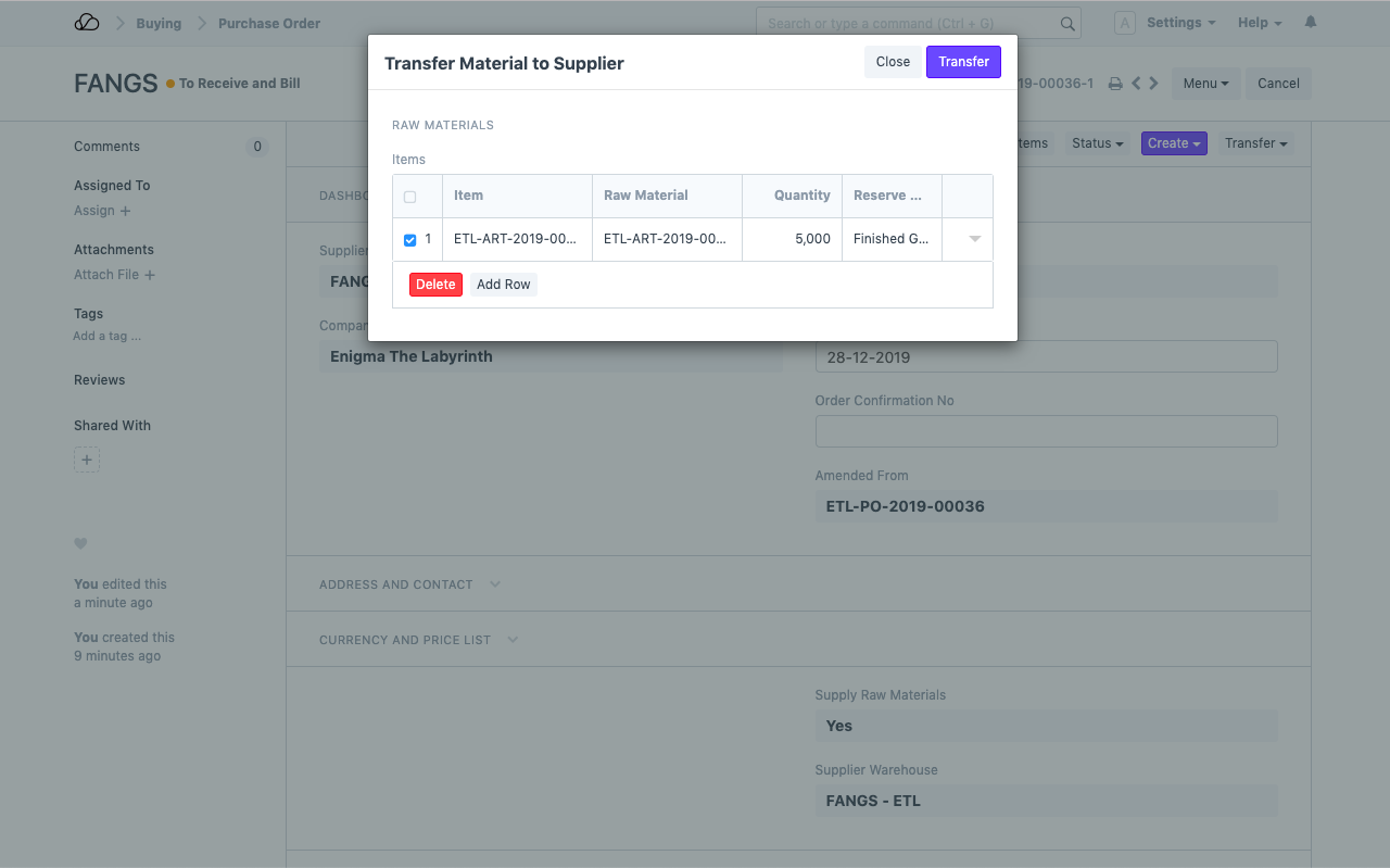 1. بعد تقديم أمر الشراء، سيكون هناك زر "تحويل" لإنشاء قيد المخزون لنقل المواد الخام إلى المورد الخارجي: