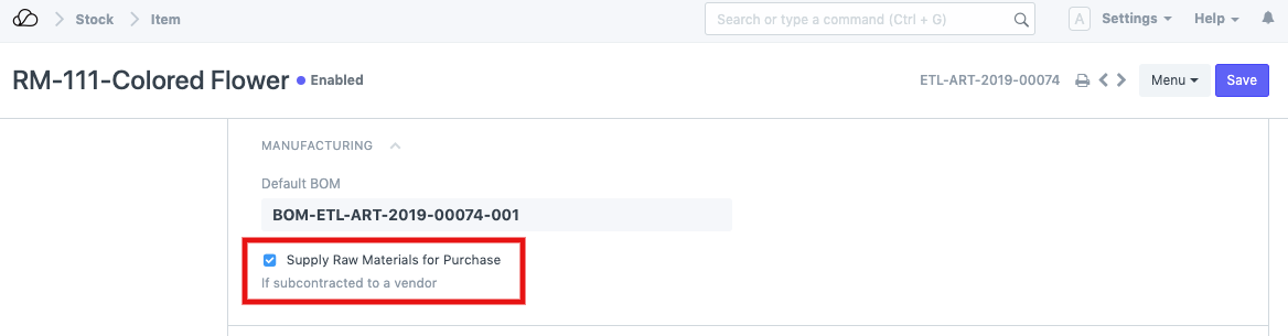 1. في العنصر الرئيسي للعنصر المتعاقد عليه من الباطن، تأكد من تمكين الخيار "توريد المواد الخام للشراء". في مثالنا، العنصر هو "زهرة ملونة RM-111"