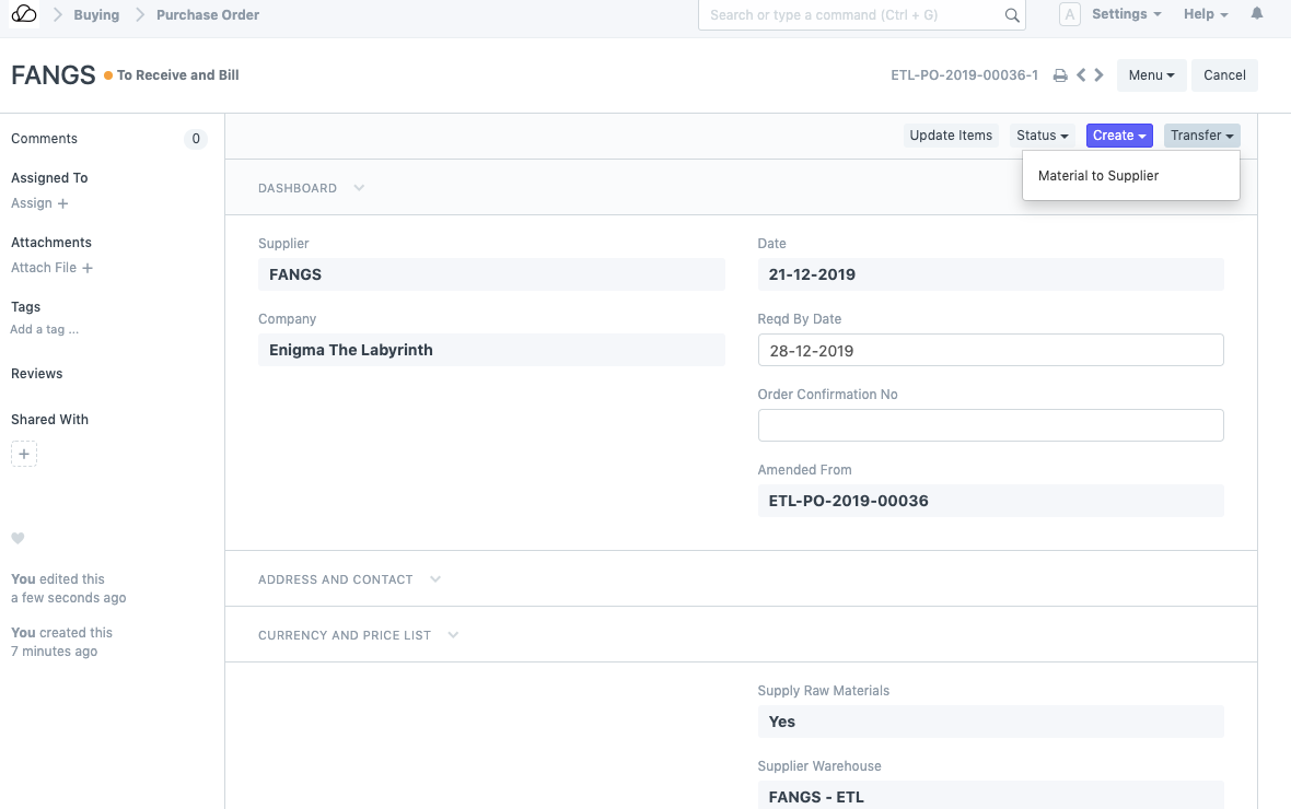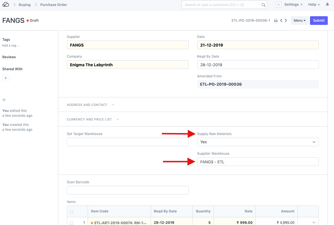 1. الآن، أنت بحاجة إلى إنشاء أمر شراء لشراء هذا العنصر من الطرف/المورد الخارجي. تأكد من تحديد "نعم" للحقل "توريد المواد الخام" ثم حدد المستودع الذي سيتم نقل المواد الخام منه إلى البائع. لاحظ أن هذا يمكن أن يكون أيضًا مستودعًا افتراضيًا ليكون بمثابة عنصر نائب لإجراء إدخال المخزون عند نقل المواد إلى البائع. فيما يلي أمر الشراء حسب مثالنا: