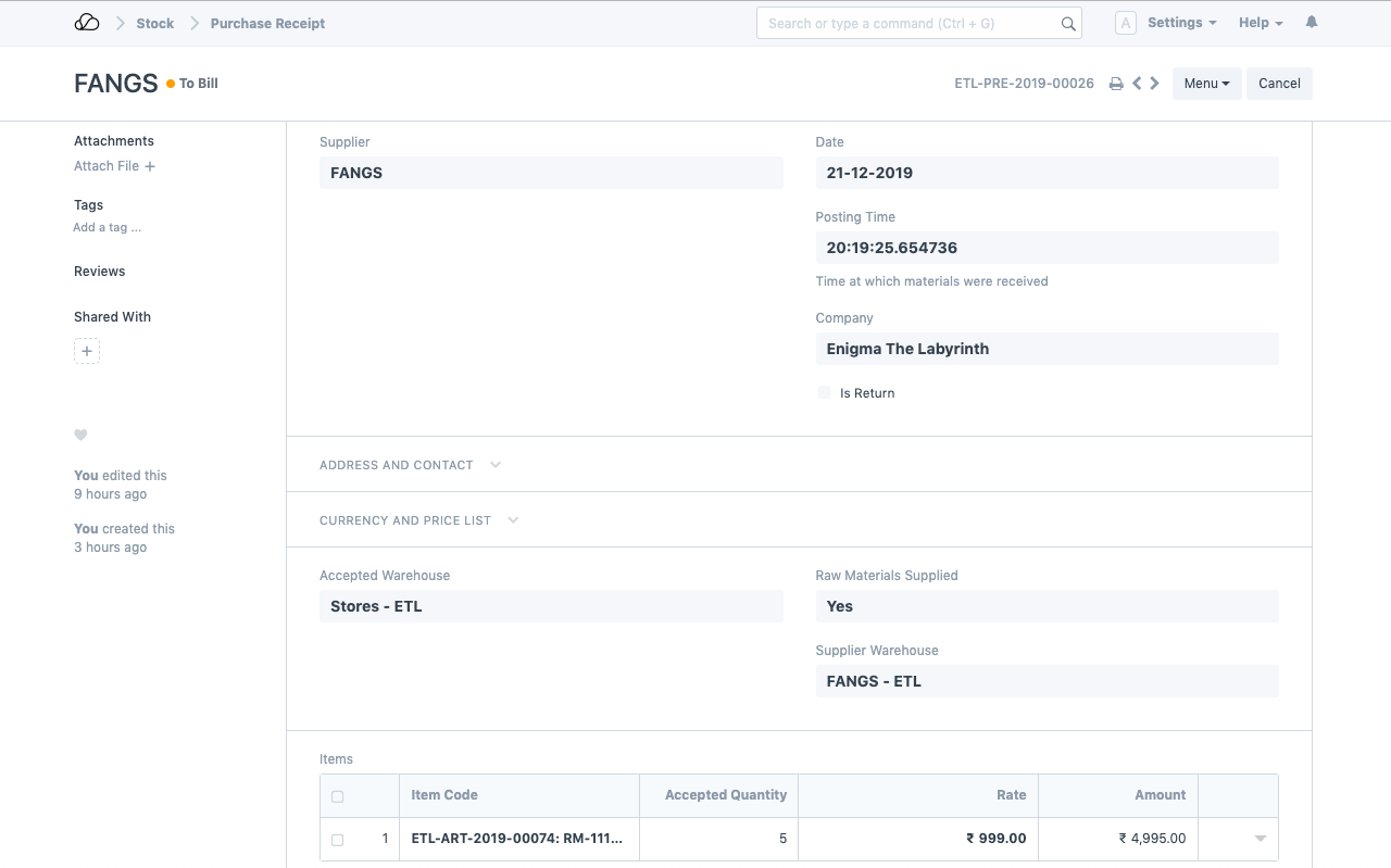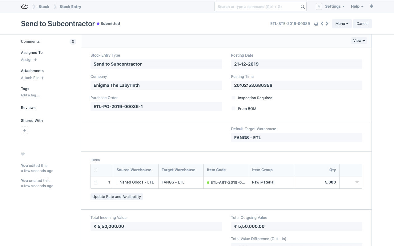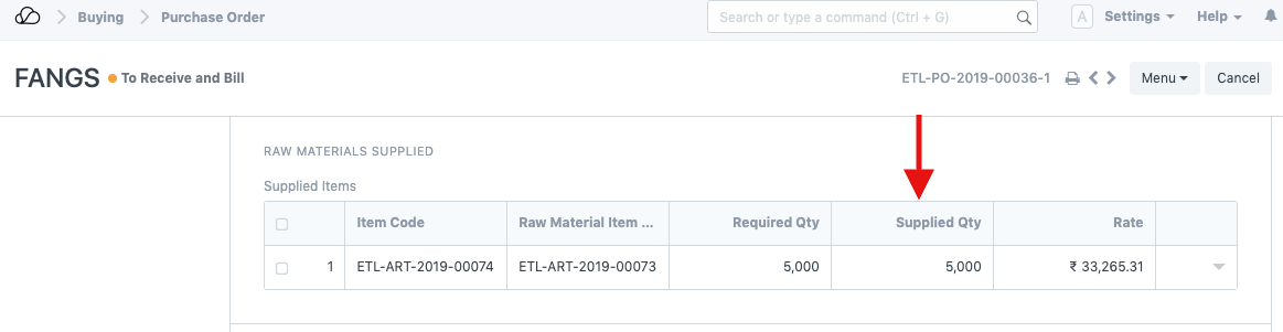 بمجرد إرسال إدخال المخزون، يتم أيضًا تحديث الجدول الفرعي في أمر الشراء ليعكس الكمية المنقولة ضمن "الكمية الموردة"