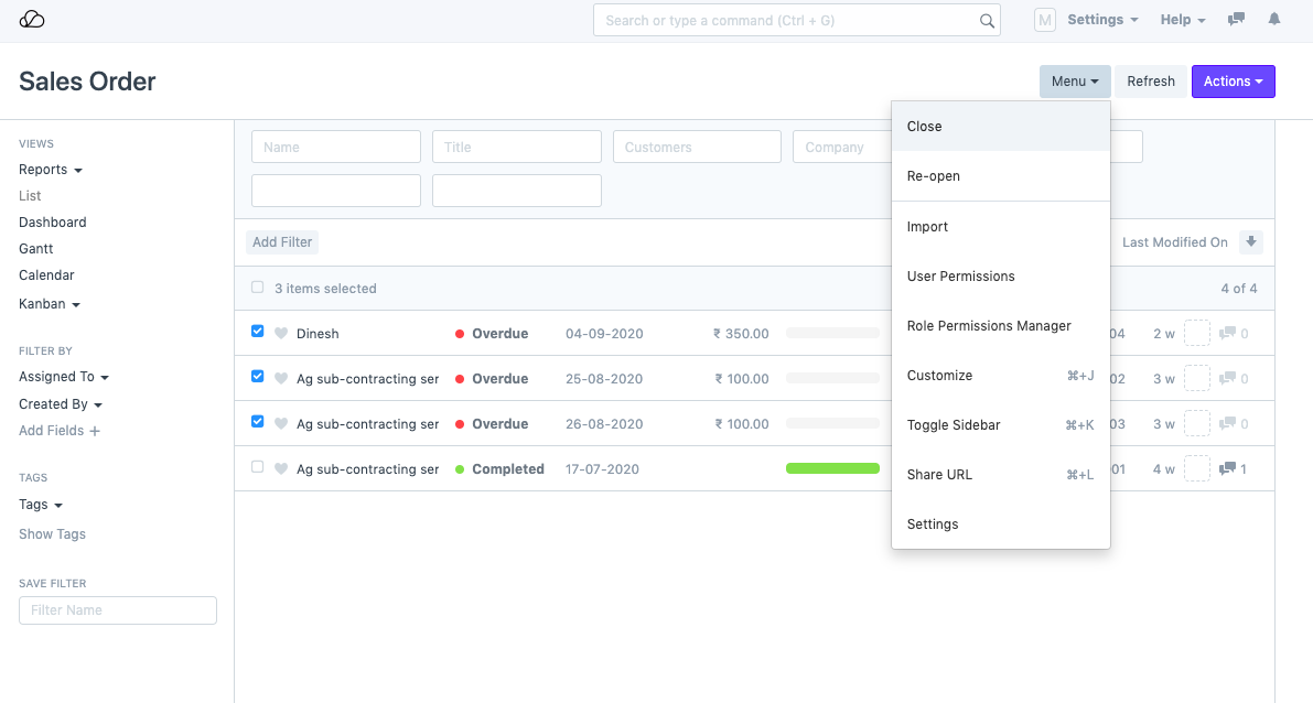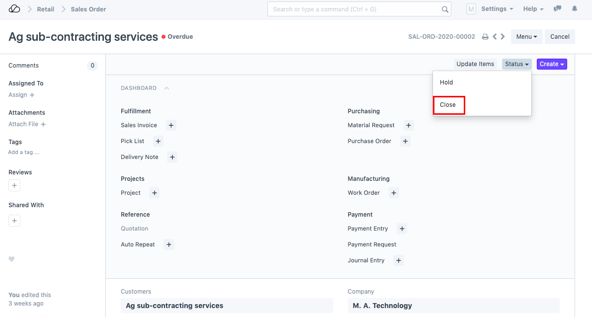 في OneOfficeERP، يمكنك إغلاق أمر المبيعات من خلال النقر على خيار "إغلاق" ضمن الحالة كما هو موضح في لقطة الشاشة أدناه.
