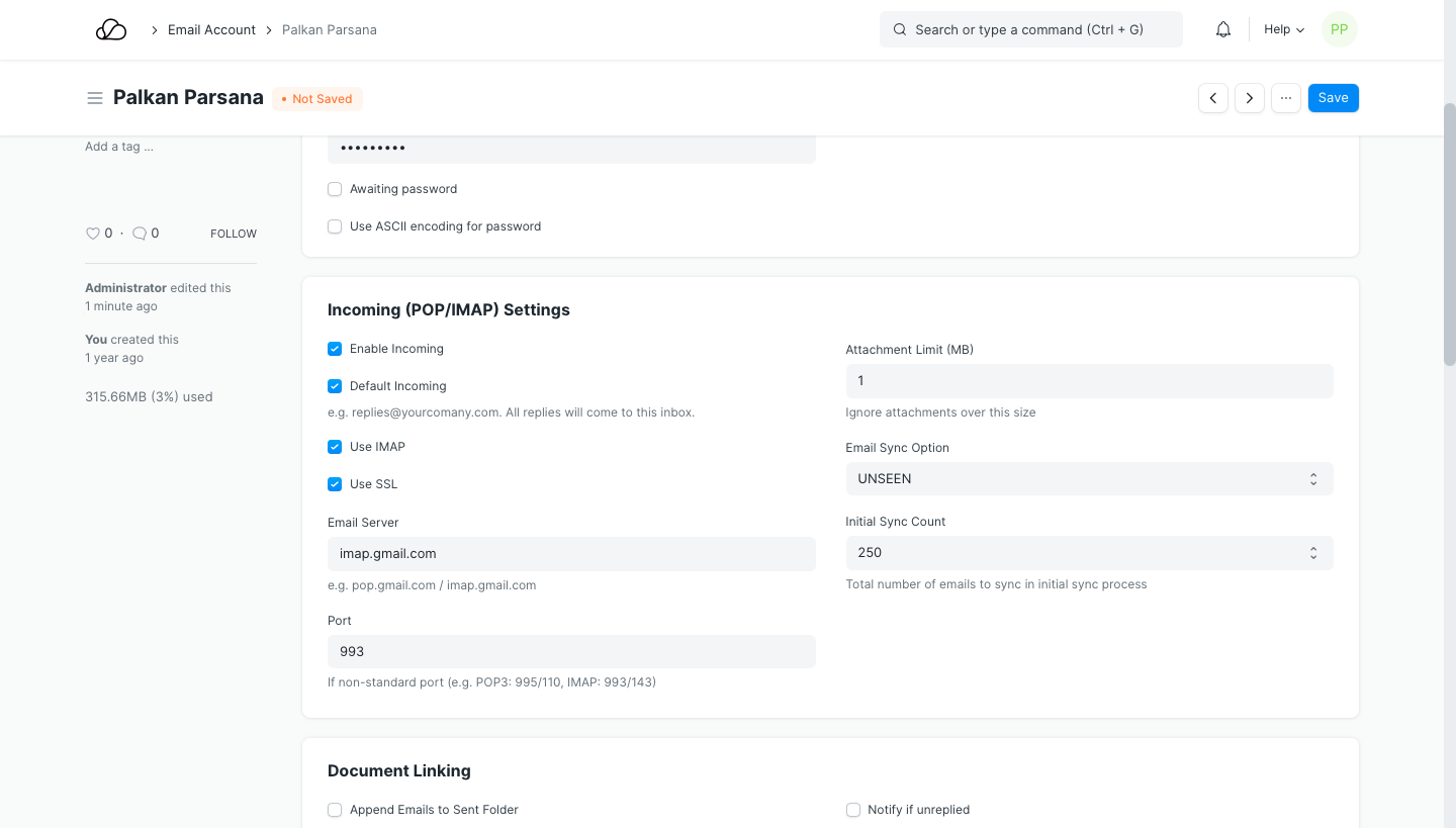 1. في سجل عنوان البريد الإلكتروني "abc@test.com" الذي تم إنشاؤه في DocType "حساب البريد الإلكتروني"، قم بتمكين مربع الاختيار "تمكين الوارد".