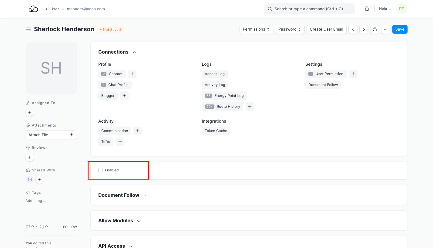 3. قم بإلغاء تحديد خانة الاختيار "ممكّن" للمستخدم المحدد