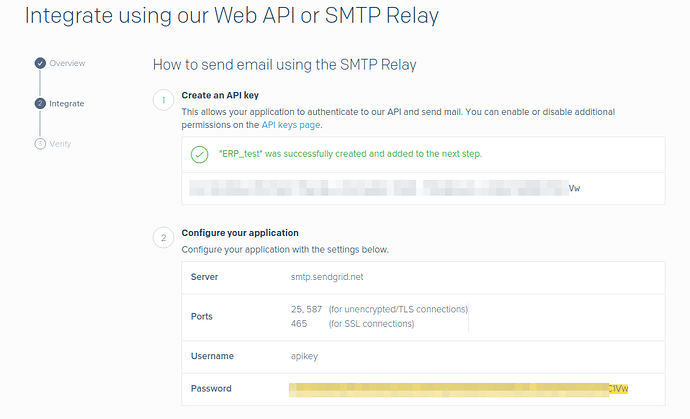 تحتاج إلى إنشاء مفتاح API لمصادقة التطبيق الخاص بك. في هذه الحالة، OneOfficeERP. تعرف على المزيد حول دمج SendGrid مع SMTP هنا