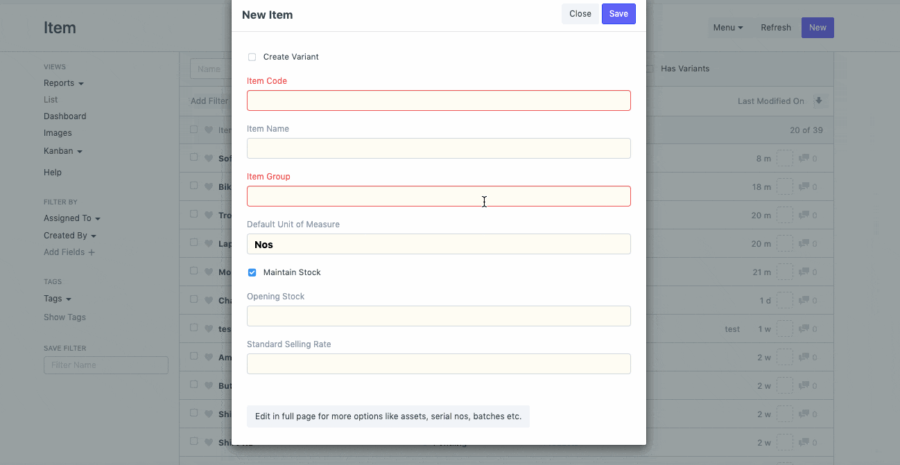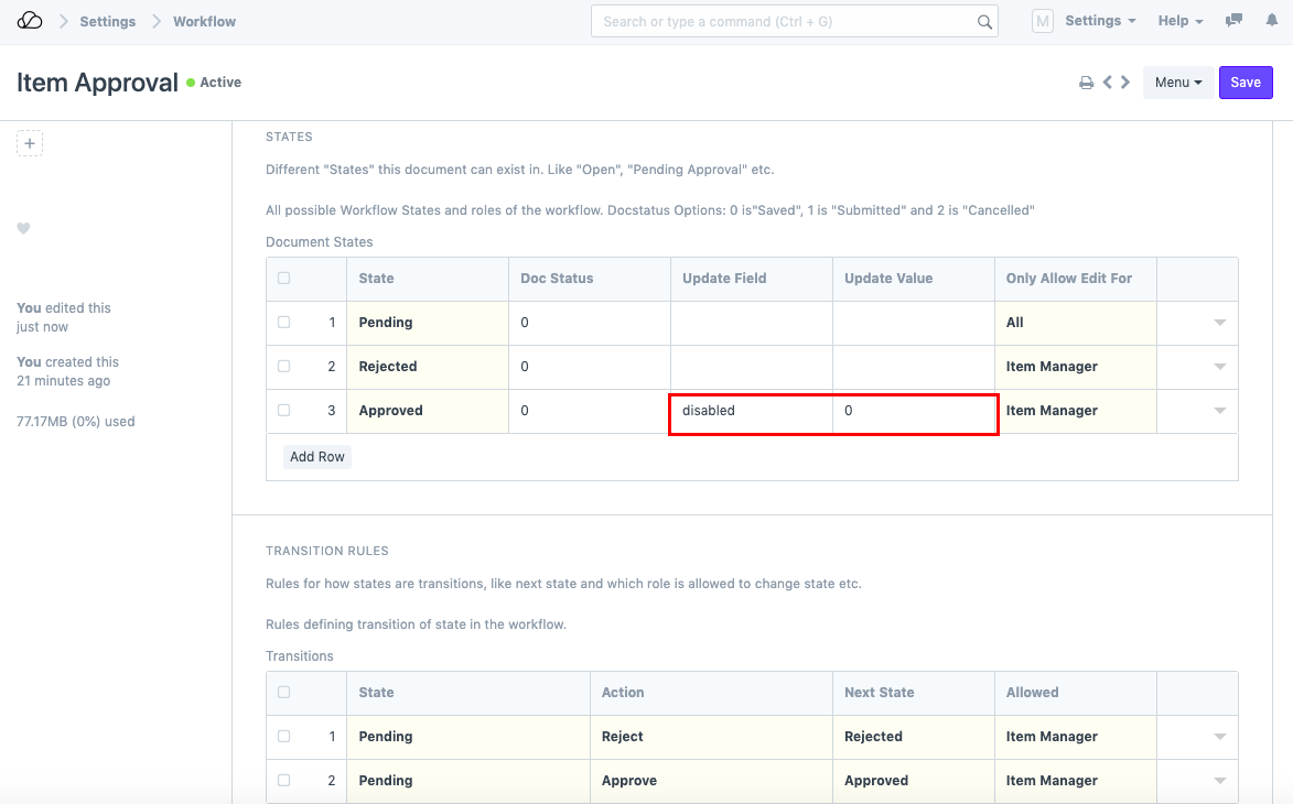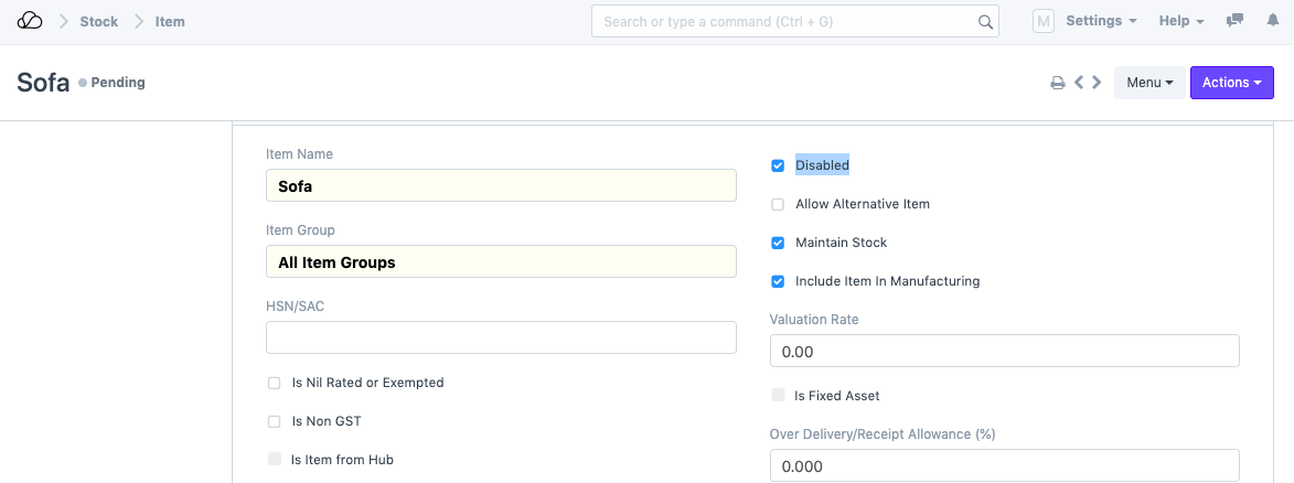 في OneOfficeERP، هذه الشرائح الرئيسية غير قابلة للتقديم. وبالتالي، حتى في حالة الرفض، في بعض الأحيان، تظل نشطة ويمكنك استخدامها في المعاملات. في هذه المقالة، أخذنا مثال سيد العنصر. سنقوم بتعيين سير عمل بسيط على العنصر ونجعله نشطًا فقط عندما تتم الموافقة عليه. للقيام بذلك، اتبع الخطوات التالية: