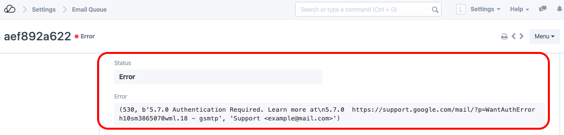 إذا كانت الحالة خطأ (كما في لقطة الشاشة أدناه)، يمكنك العثور على سبب الخطأ عن طريق فتح هذا البريد الإلكتروني والتمرير لأسفل إلى حقل الخطأ لمعرفة الخطأ.