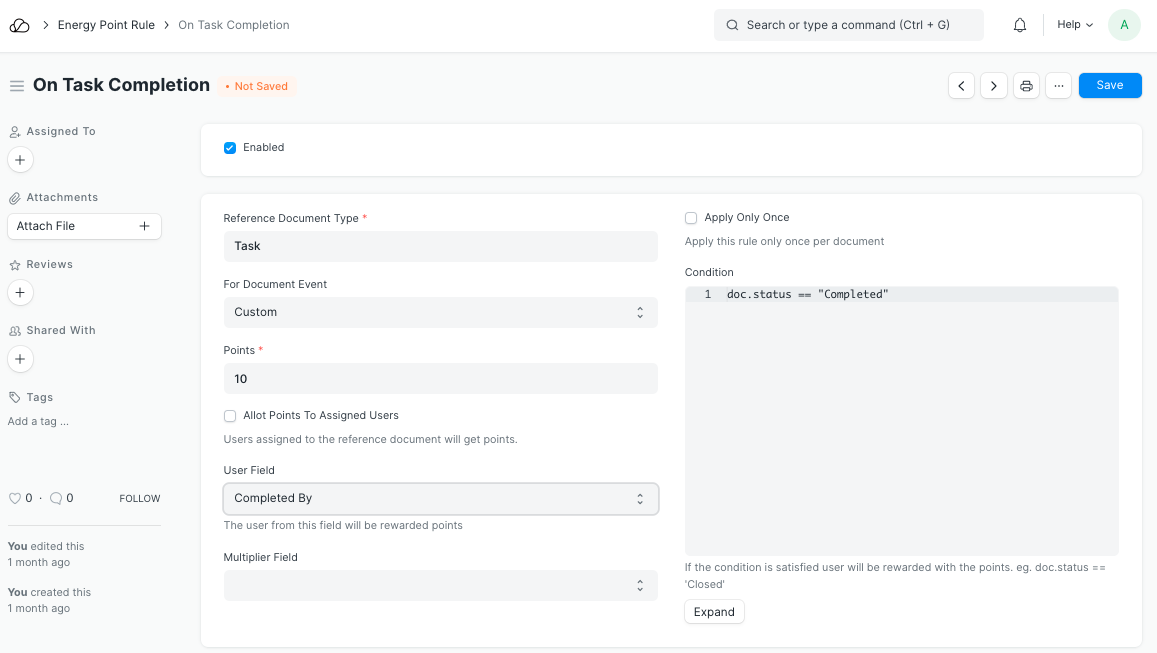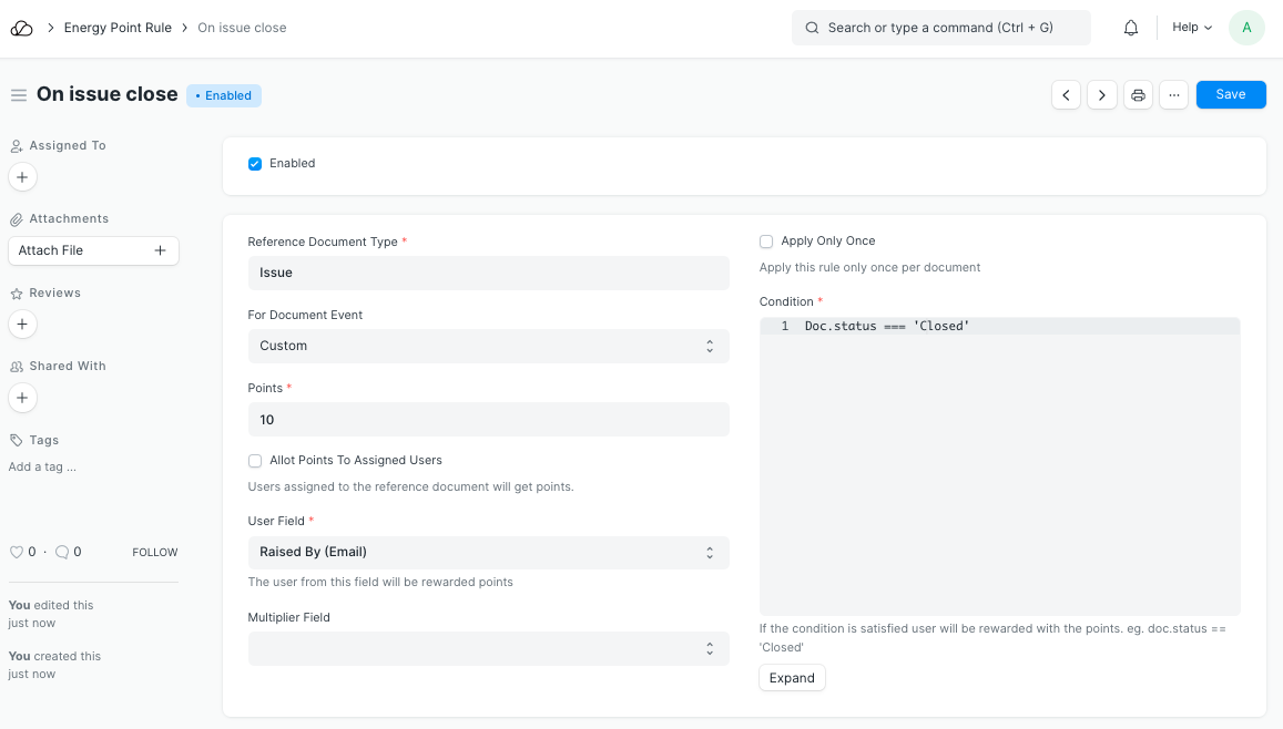 الحالة شرط توزيع النقاط على سبيل المثال. `doc.status == 'مغلق''. سيتحقق الشرط أعلاه مما إذا كان حقل "الحالة" في المستند "مغلقًا" وإذا كانت الإجابة بنعم، فسيتم تخصيص النقاط للمستخدم.