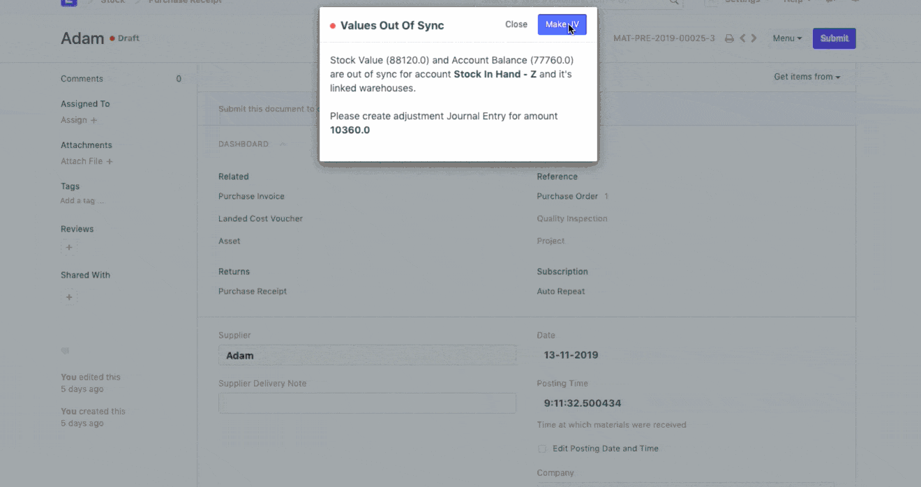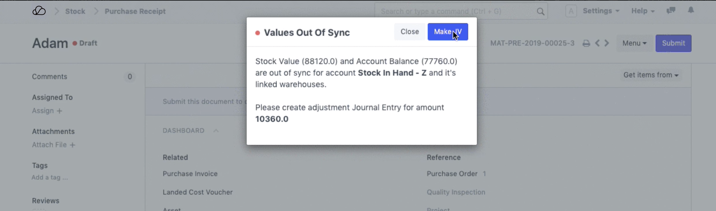 للمضي قدمًا، يمكنك بسهولة مزامنة رصيد المخزون ورصيد حسابات الأسهم عن طريق إنشاء إدخال دفتر اليومية. انقر فوق "إنشاء زر إدخال دفتر اليومية" في رسالة التحقق من الصحة، وقم بتحديث الحسابات ذات الصلة وأرسل إدخال دفتر اليومية.