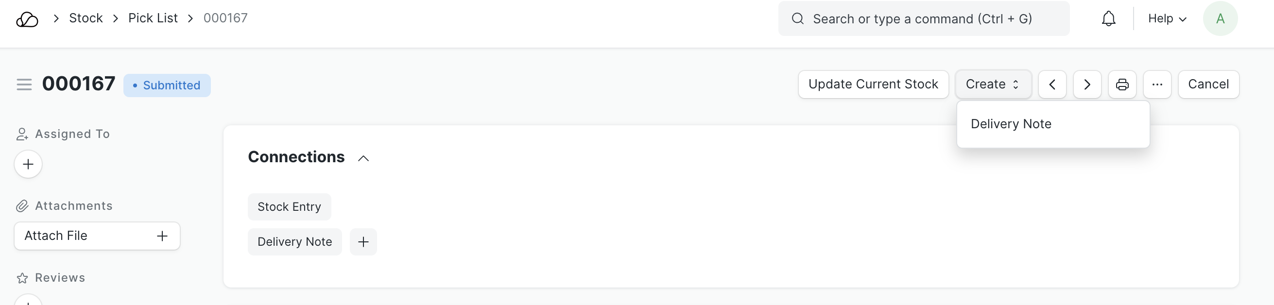 عند إرسال مذكرة التسليم، يتم إجراء إدخال دفتر أستاذ المخزون لكل عنصر ويتم تحديث المخزون. يتم تحديث الكمية المعلقة في أمر المبيعات (إن أمكن).