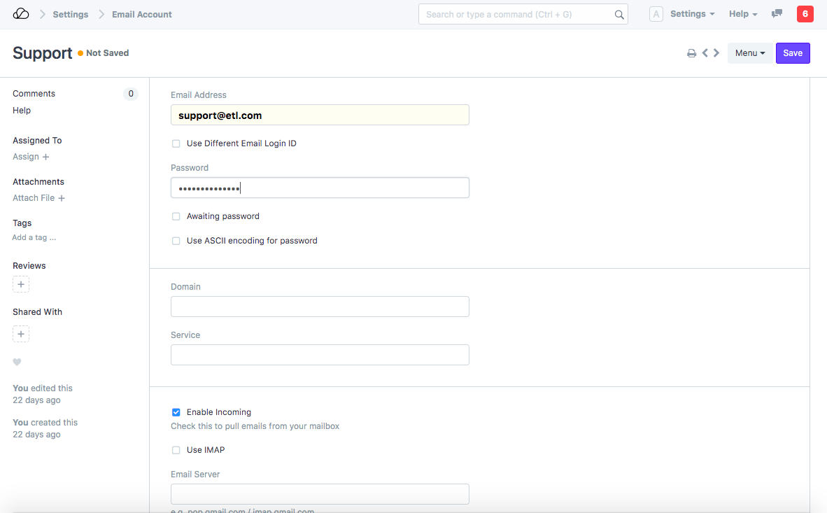 أولاً، نحتاج إلى إعداد حساب بريد إلكتروني يُلحق رسائل البريد الإلكتروني الواردة المستلمة هناك في DocType "الإصدار" الخاص بـ OneOfficeERP.