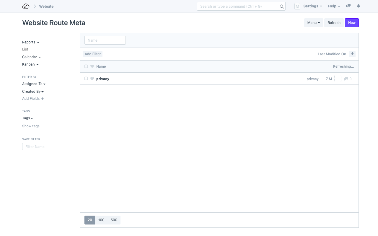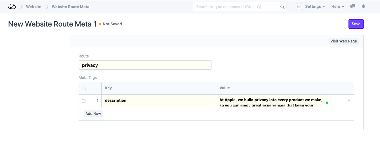 باستخدام شريط رائع (شريط البحث العالمي)، افتح "New Website Route Meta".