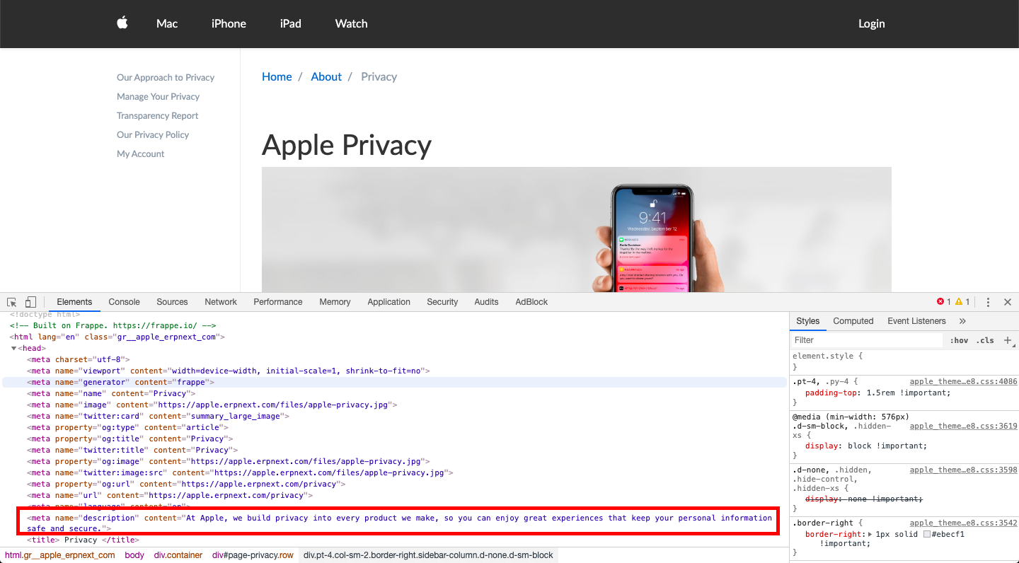 في مثالنا، قمنا بإجراء التغيير على صفحة الخصوصية، وقمنا بإدخال المفتاح (description) وقيمته كما هو موضح.